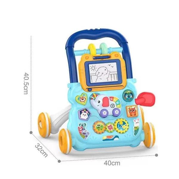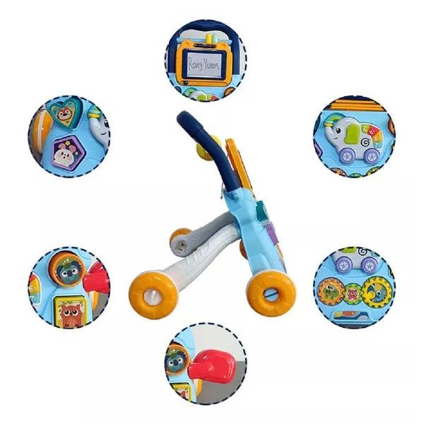 Andadera Multifuncional con Tablero Elefante Azul ideal para acompañar los primeros pasos del bebé. Diseñada con múltiples actividades sensoriales, sonidos, engranajes giratorios, pizarra de dibujo y botones interactivos. Su estructura es resistente y segura, perfecta para estimular la coordinación, equilibrio y habilidades motoras.
