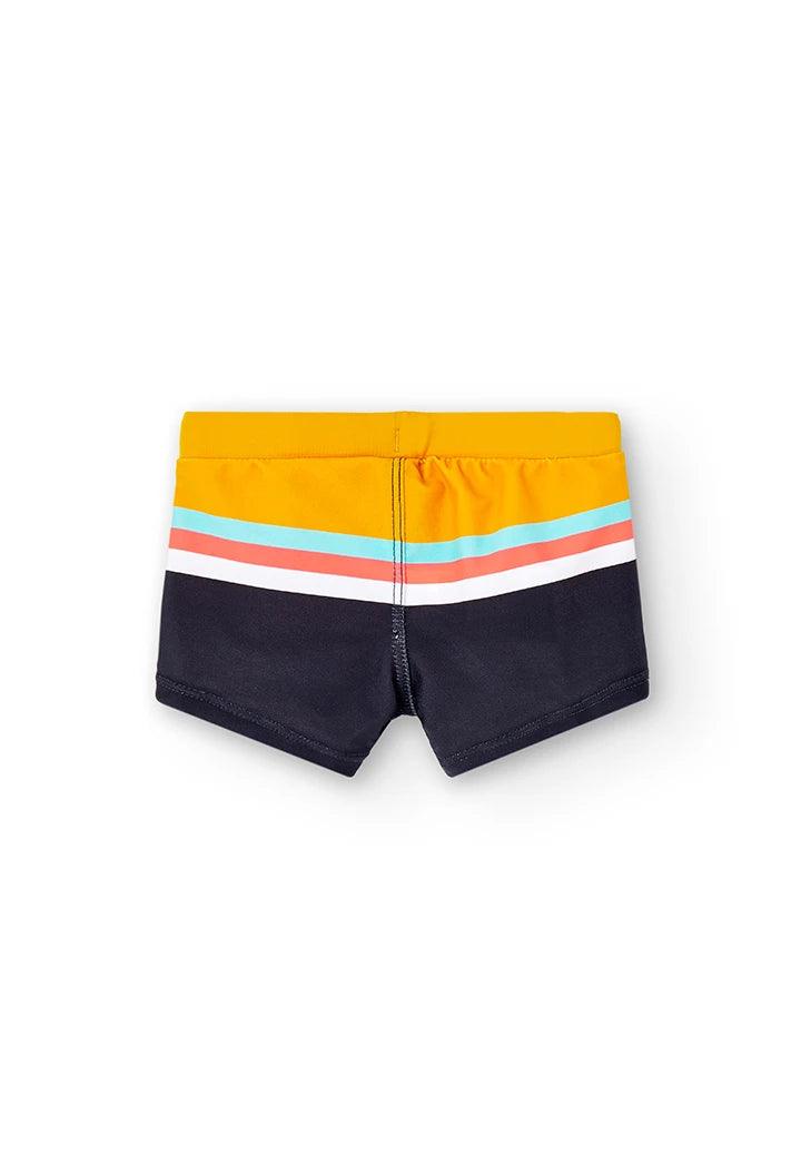 Bond de poliamida de bebé niño estampado con tres franjas de colores. Se ajusta a la cintura con goma interior y cordón. La decoración es un estampado en varios colores.