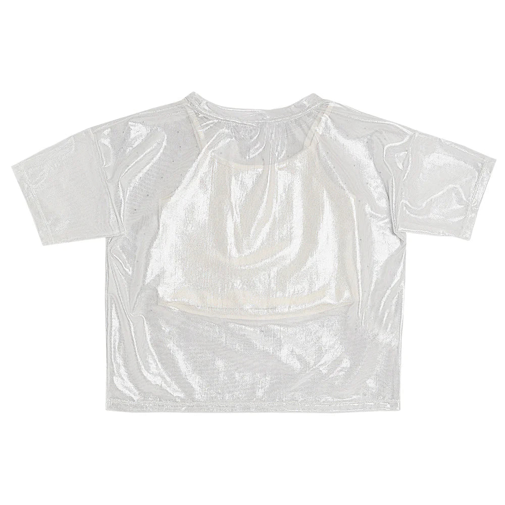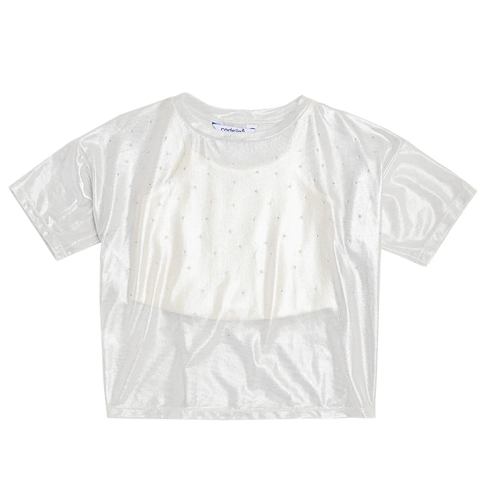 | Diseño | Crop top con capa de malla y detalles brillantes |