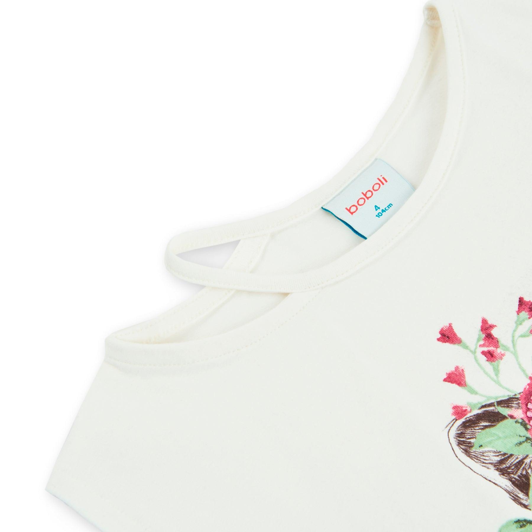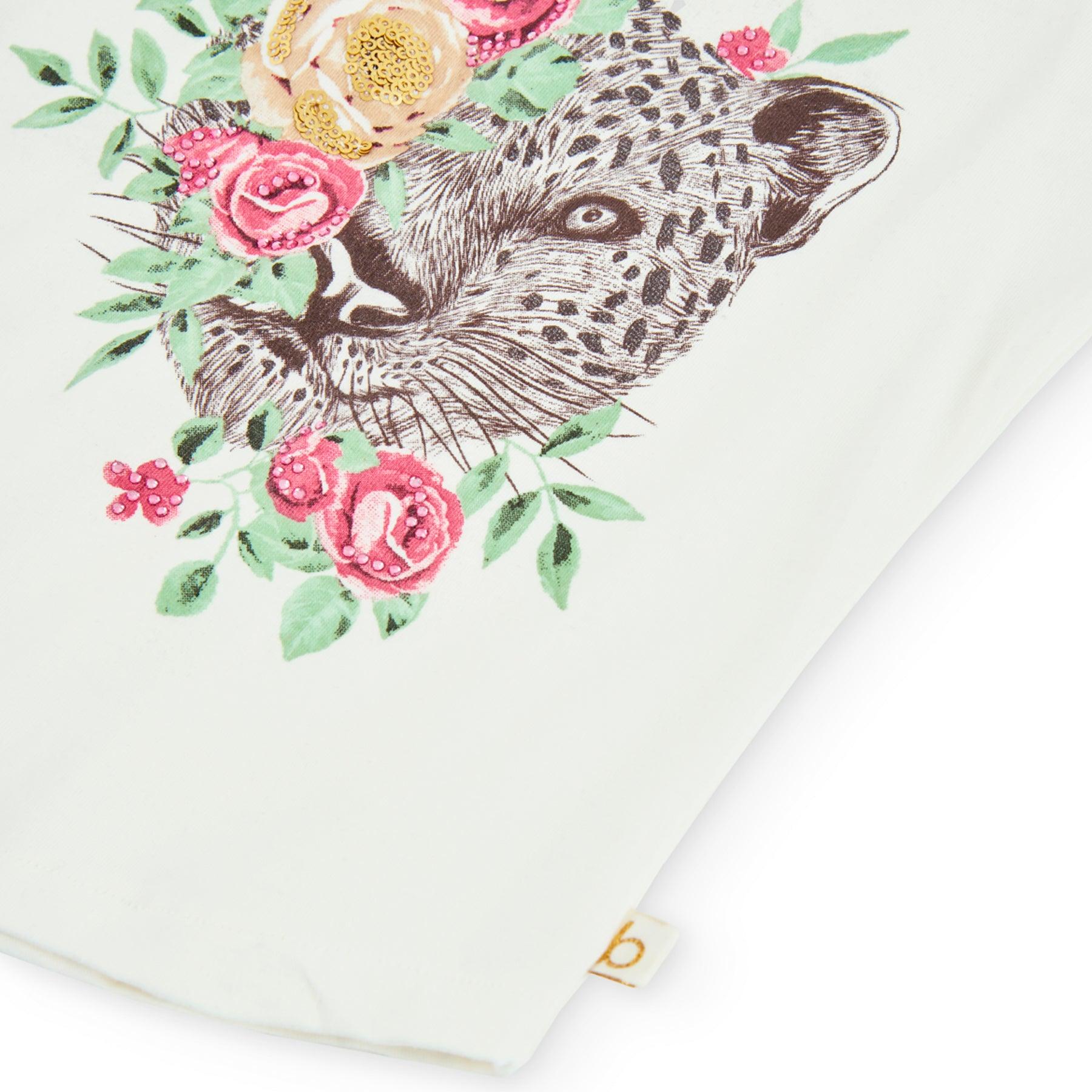 Camiseta de niña con manga de punto elástico en color blanco químico. En el delantero lleva un estampado de un leopardo, con lentejuelas, cristales y purpurina aplicado como decoración. El hombro es escotado. Lleva etiqueta de la marca