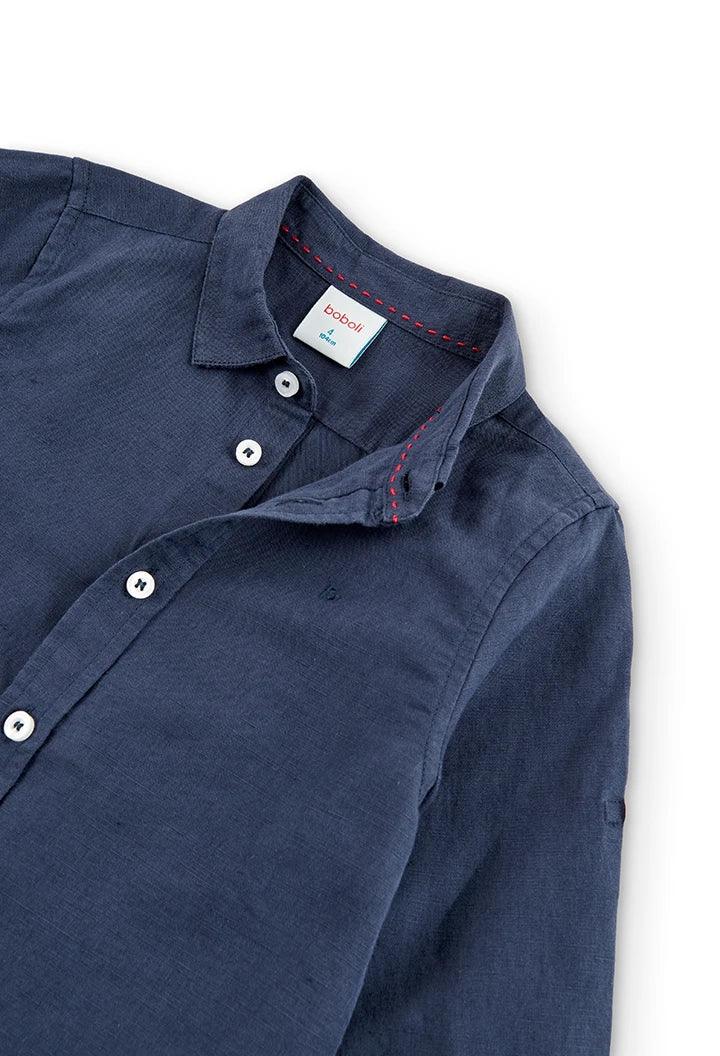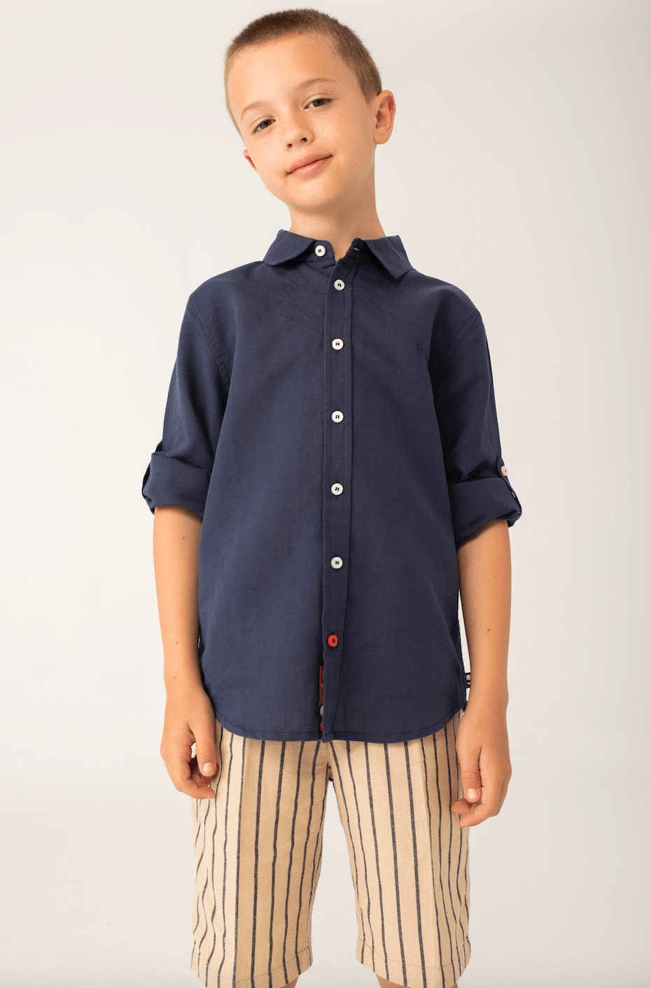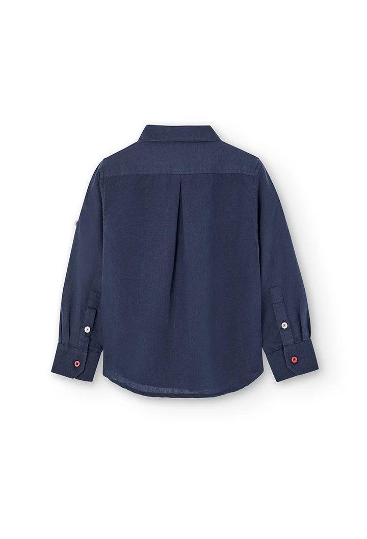Camisa manga larga de niño en lino, en color marino . Se cierra con botones en delantero y puño. Las mangas se pueden subir y fijar con tira y botón . Tiene como detalle etiqueta y bordado de la marca
