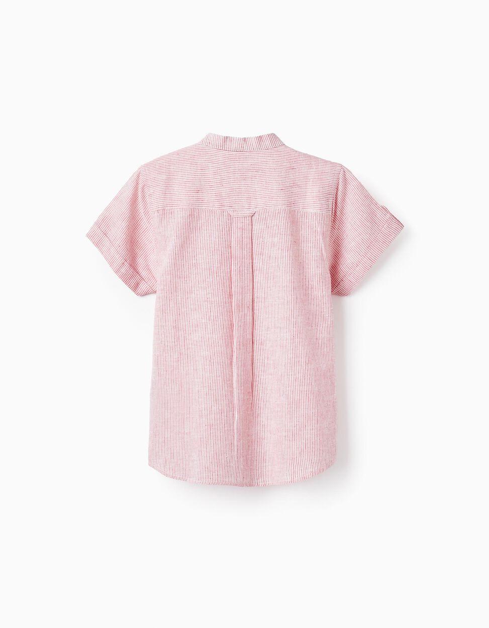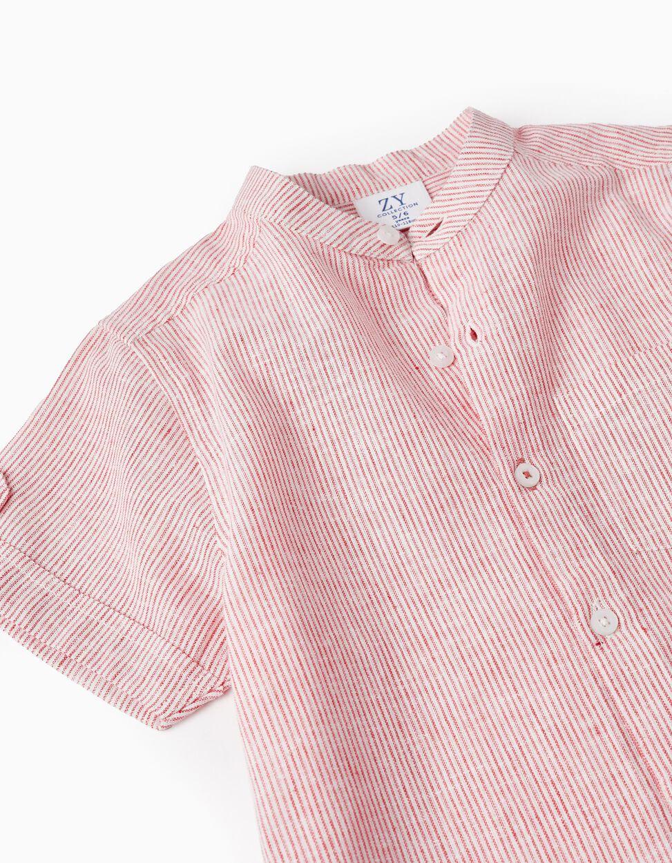 Camisa de manga corta para niño, con patrón a rayas blancas y rojas. Fabricada en mezcla de algodón y lino. Se abrocha por delante con botones. Bolsillo en el pecho. Pasadores decorativos en las mangas. Una camisa con material ligero y cómodo, un básico para todos los armarios. Big Me: un botón con hilo y ojal a contraste para que el niño identifique fácilmente dónde empezar a abotonar, desarrollando su autonomía.
