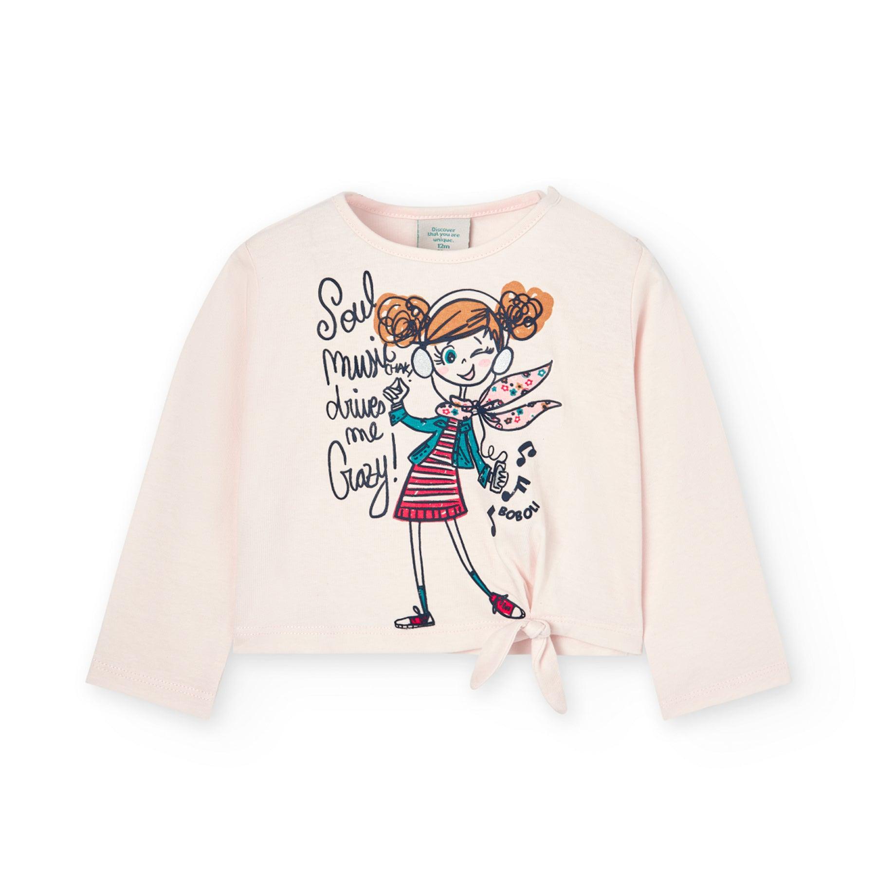 Camiseta de niña en punto liso blanco roto, abrochada con cierres a presión por hombro. Como decoración lleva una niña estampada en varios colores. Como detalle tiene un nudo en la parte inferior izquierda. Disponible desde la talla 6 meses a 8 años