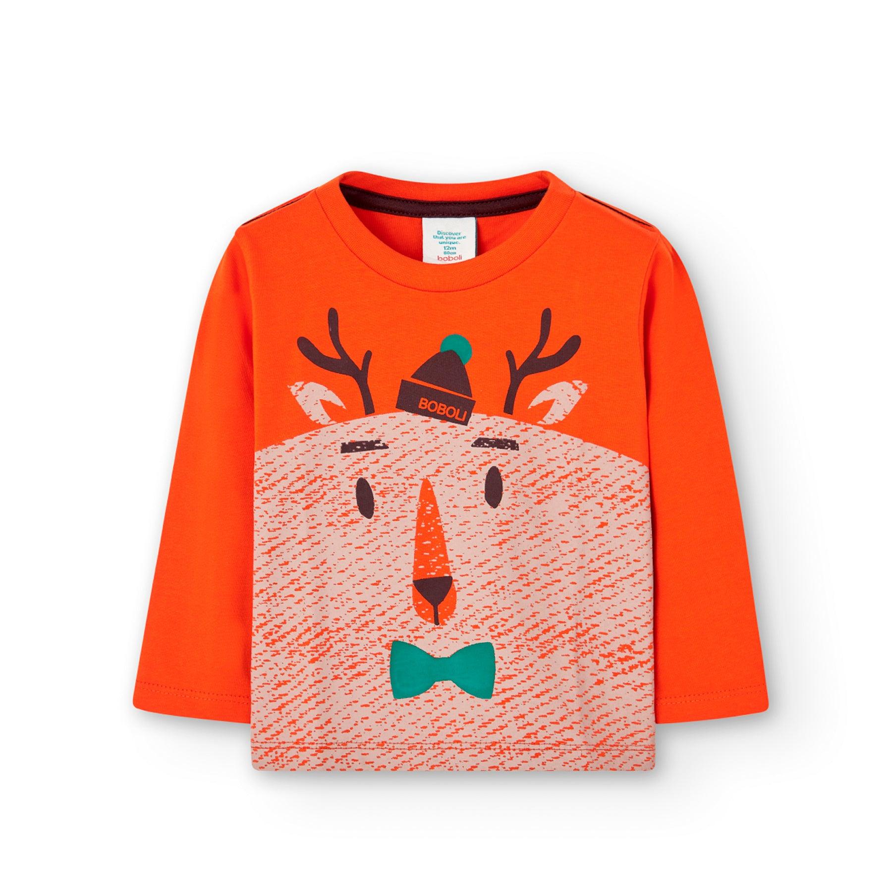 Camiseta de niño en punto liso color naranja. Como decoración tiene un estampado grande divertido, en varios colores, de la cara de un animal. Disponible desde la talla 6 meses hasta los 8 años.