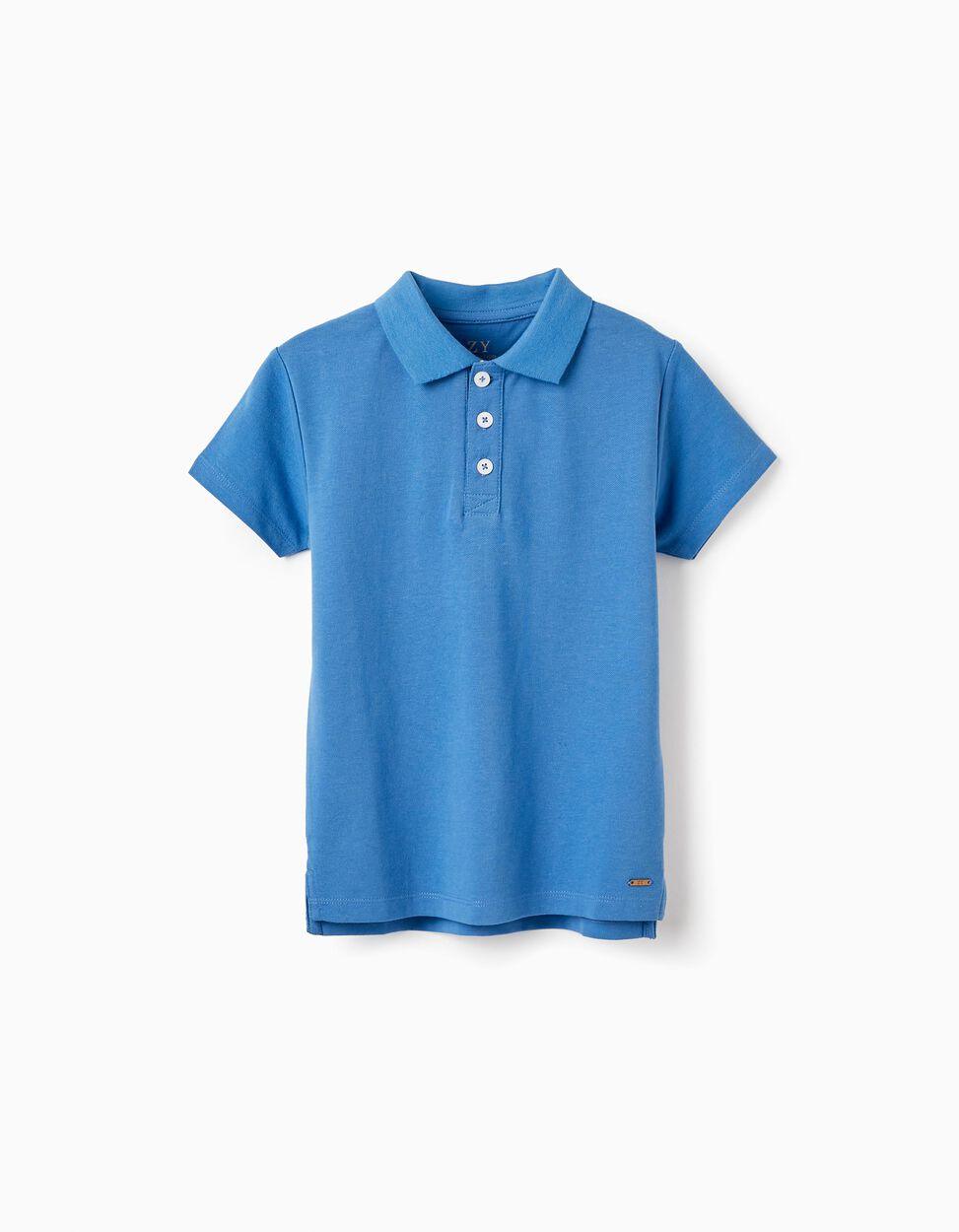 Polo azul de manga corta para niño, en piqué 100% algodón. Base asimétrica ligeramente más larga en la parte trasera, con pequeñas aberturas en los laterales para dar un toque fluido. Etiqueta estampada para no irritar la piel. Un básico del armario, perfecto para todos los estilos, desde el más tradicional hasta el más moderno.