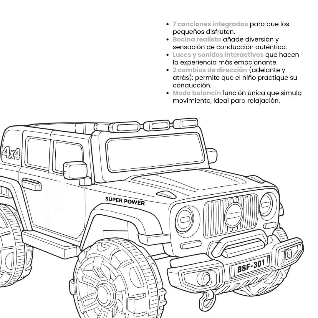 | Funciones | 7 canciones integradas, botón de bocina, modo balancín, cambio de luces, luz y sonido, 2 cambios (adelante y atrás) |