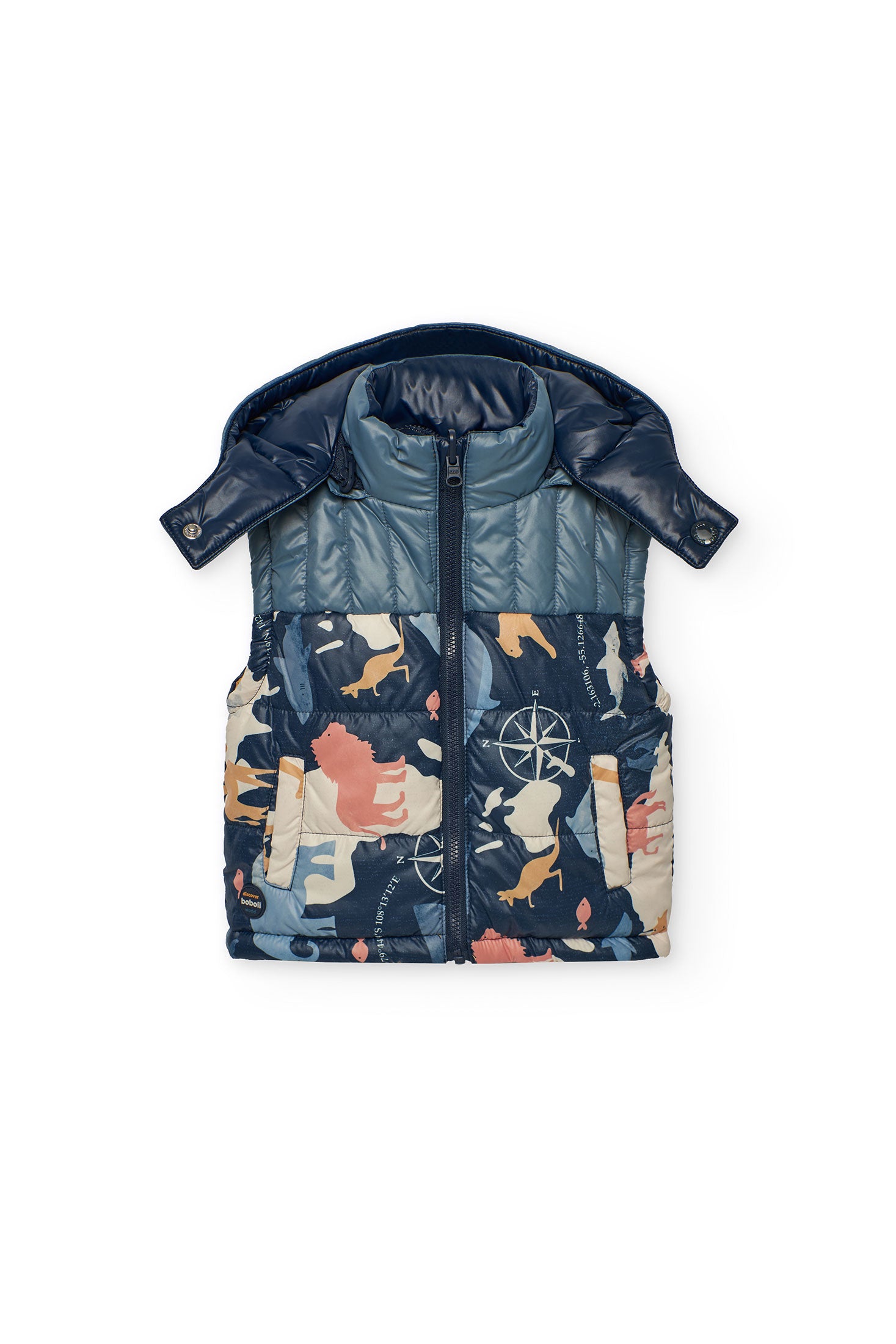Este chaleco reversible de Boboli ofrece dos estilos en una sola prenda: un lado liso en tonos mostaza y azul marino con frase “Discover the World”, y el otro con un colorido estampado de animales y brújulas que evoca la aventura y la exploración.