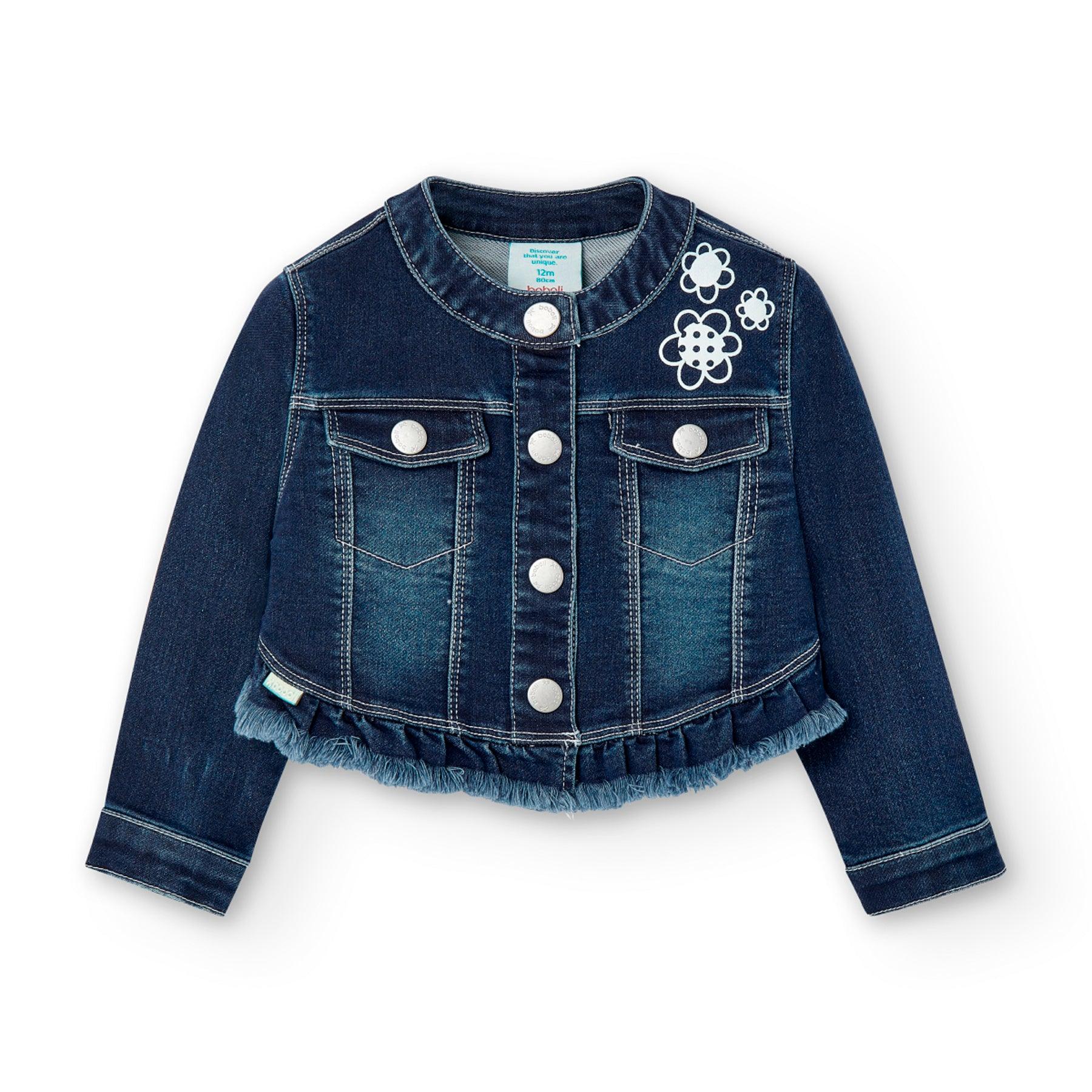 Cazadora de niña en tejano de punto elástico en color azul oscuro , con cierre a presión en delantero y puños, con bajo deshilachado y bolsillos decorativos. La decoración es un estampado en color blanco de unas flores en delantero, junto a una etiqueta con detalle de la marca