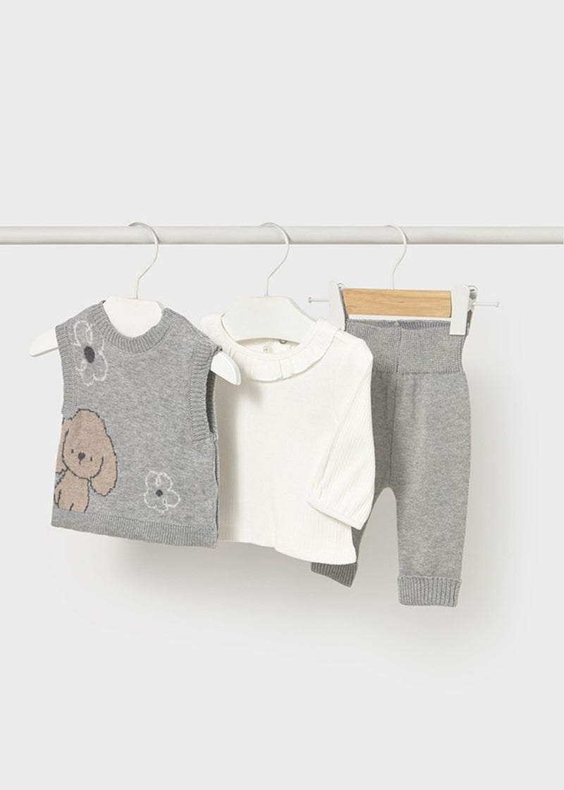 El Conjunto Chaleco Tejido Mayoral es ideal para los primeros días de tu bebé, ofreciendo comodidad, suavidad y un diseño encantador. Este set de tres piezas incluye una camiseta manga larga, un chaleco tejido con un acabado elegante y una polaina a juego. Elaborado en fibras de algodón, poliamida y elastano que aportan suavidad, calidez y libertad de movimiento.