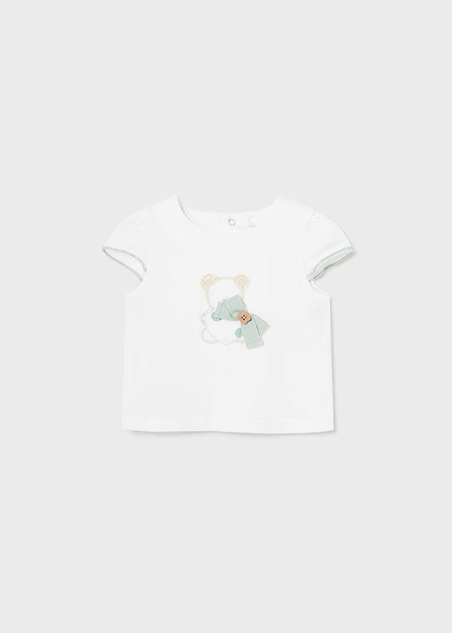 Camiseta de manga corta para recién nacido. Cuello redondo. Cierre con botones a presión en la parte posterior. Elementos de adorno: bordado.