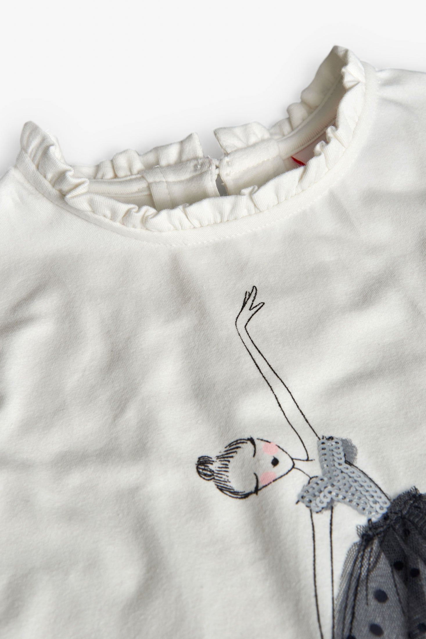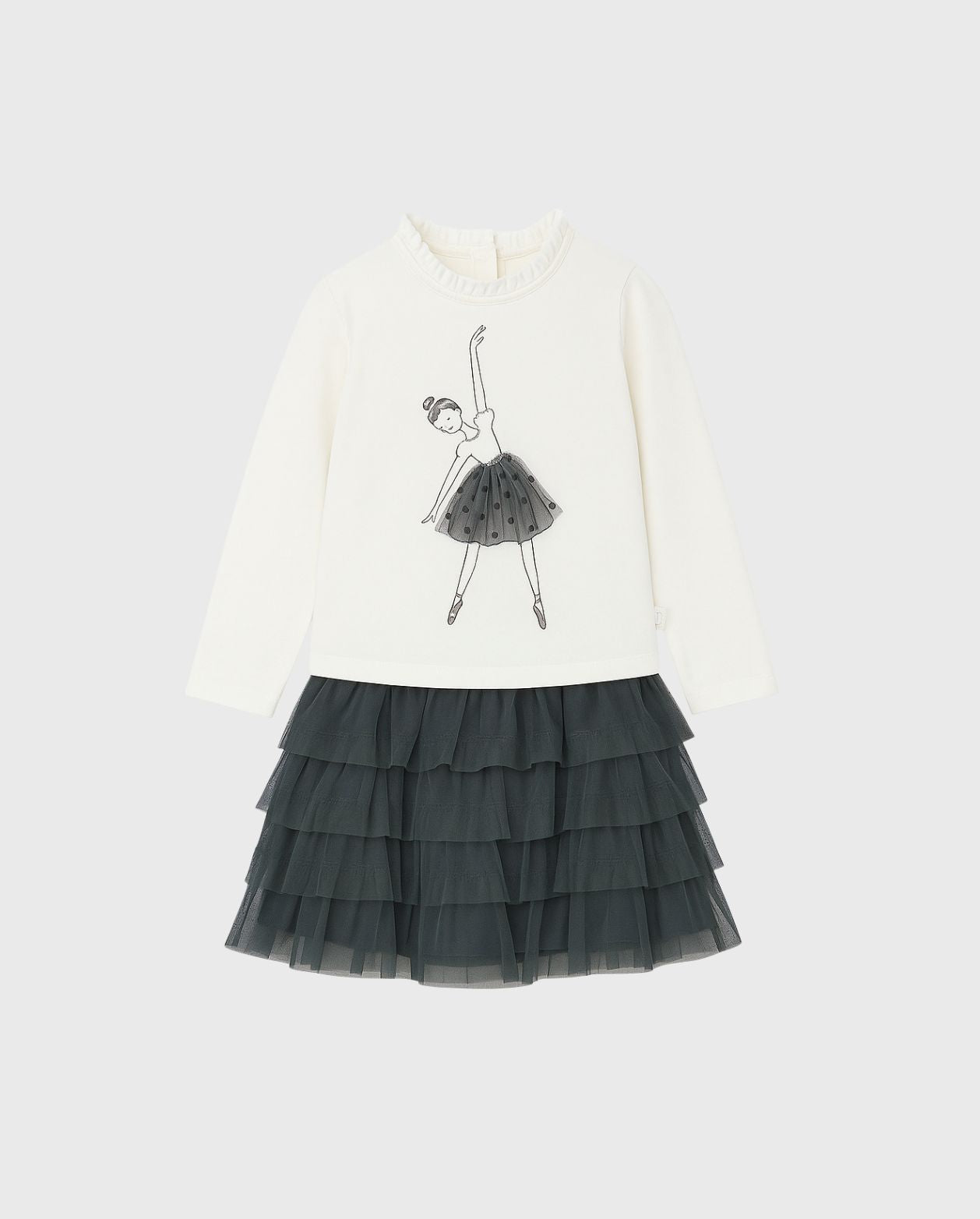 | Color | Blusa blanca con estampado de bailarina y falda gris de tul |