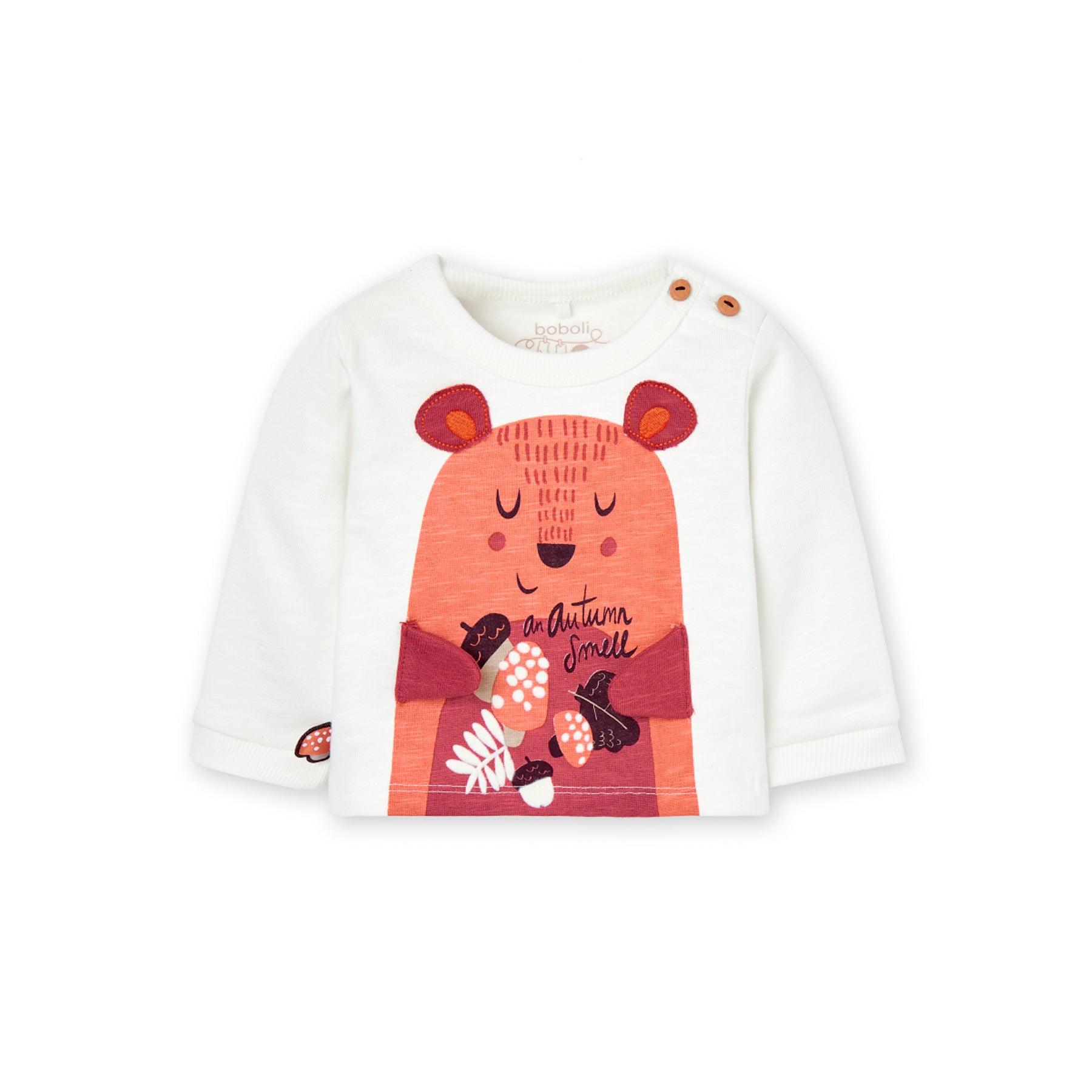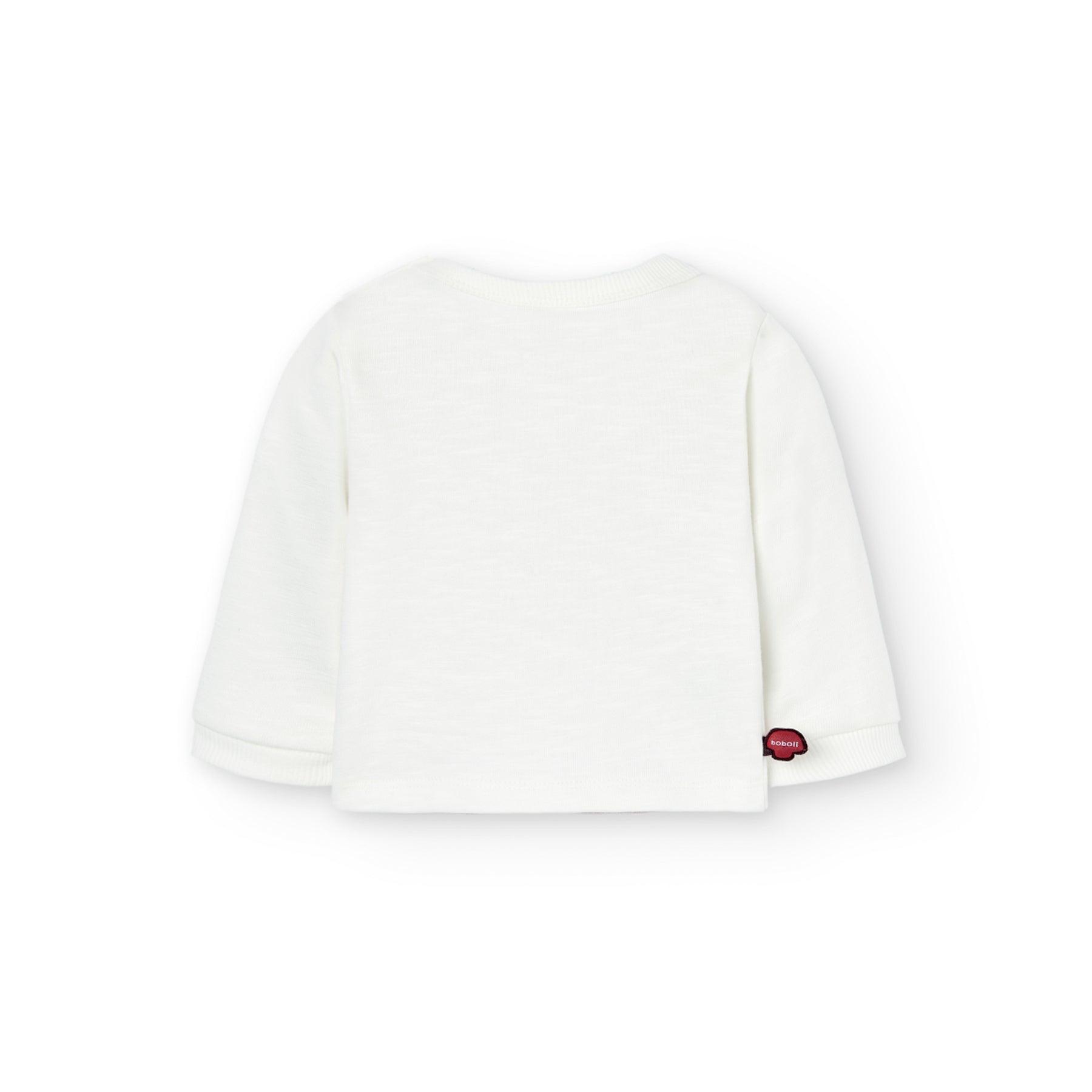 Sudadera de felpa de bebé niño en color blanco químico, se abrocha con botones. La decoración es un gran estampado con detalles aplicados en varios colores. Disponible de la talla 0 meses a 2 años.