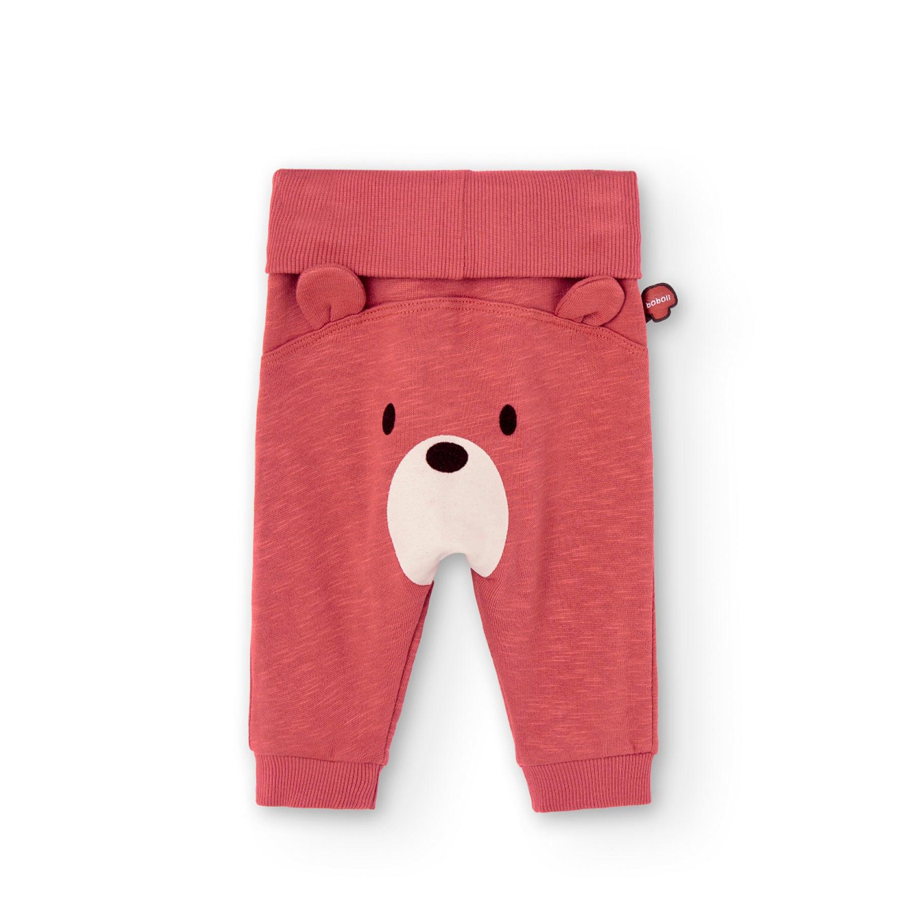 Pantalón de felpa de bebé niño en color calabaza, lleva una pieza de canalé en la cintura. La decoración es un estampado en varios colores en la parte trasera. Disponible de la talla 0 meses a 2 años.