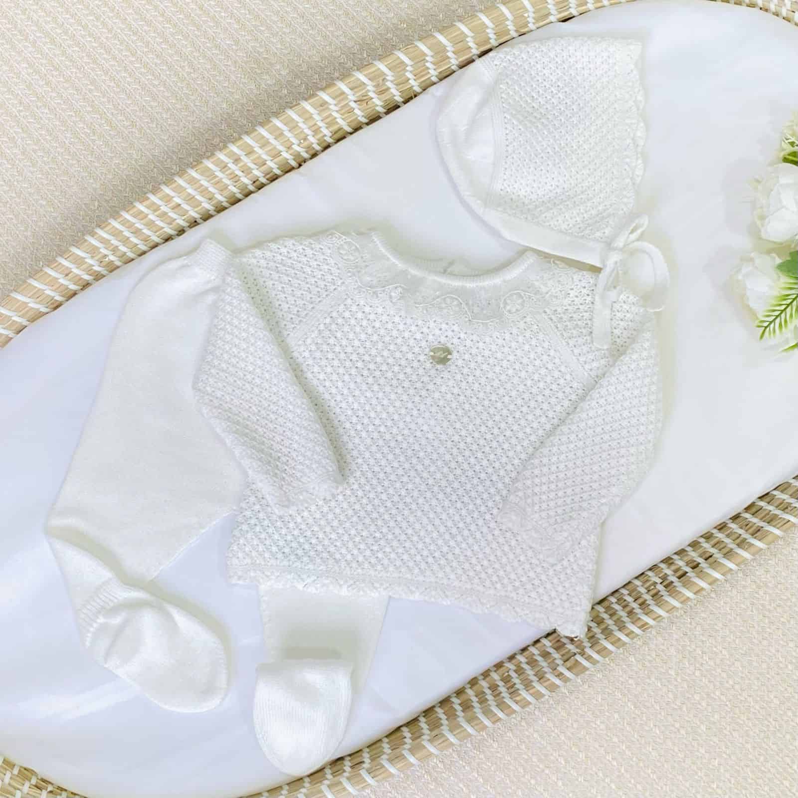 ¡Elegancia y dulzura para los primeros días de tu bebé! Este delicado conjunto tricot en color crudo con bolero y detalles de encaje es perfecto para brindar calidez y suavidad desde el primer momento. Su diseño clásico y refinado lo convierte en una opción ideal para ocasiones especiales.