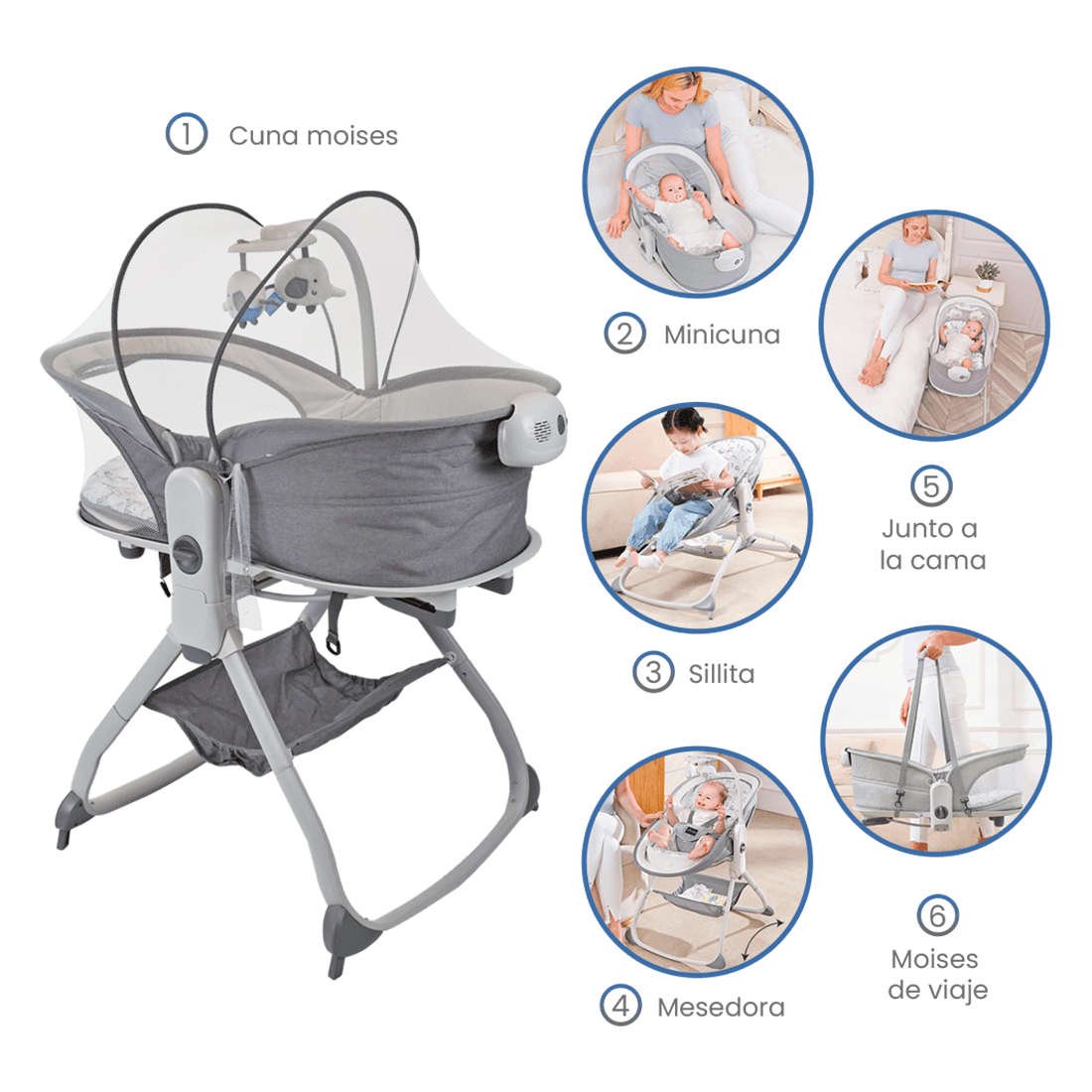 Cuna Colecho Mecedora Multinacional 6 en 1 Gris Priori es la opción ideal para acompañar los primeros años de tu bebé con comodidad, seguridad y versatilidad. Diseñada para adaptarse a cada etapa de crecimiento, integra múltiples funciones en un solo producto, permitiendo usarla como minicuna, moisés, mecedora, asiento y colecho.
