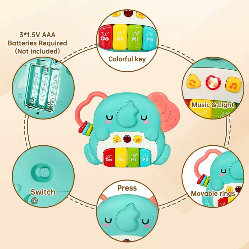 El Juguete Musical Piano Elefante es un juguete interactivo ideal para estimular el aprendizaje musical y sensorial de los más pequeños. Con diseño en forma de elefante, integra teclas de piano, melodías divertidas y sonidos educativos que ayudan al niño a reconocer notas, colores y animales mientras se divierte.