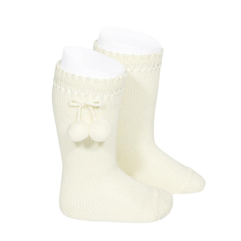 Calcetines altos para bebé fabricados en 100% algodón perlé con borlas a tono. Disponibles en talla 000 de (0-3 meses) a 1 año