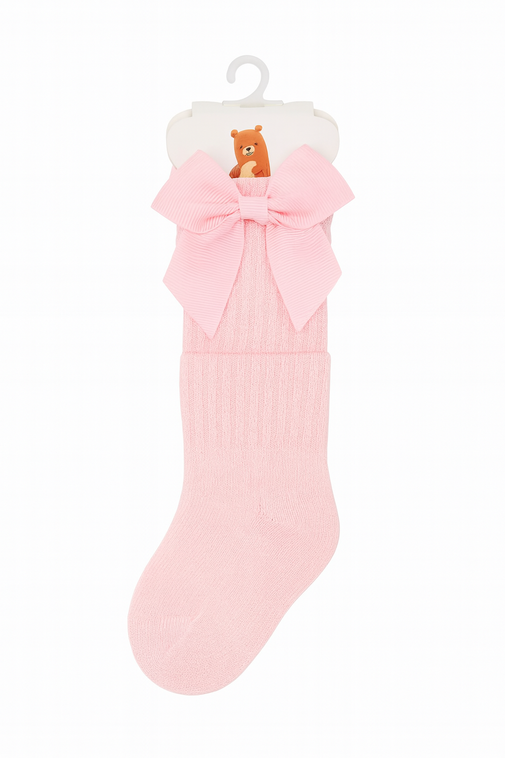 Medias largas blancas con moño decorativo, perfectas para complementar looks elegantes y delicados. Suaves, cómodas y con excelente ajuste para bebés o niñas pequeñas.