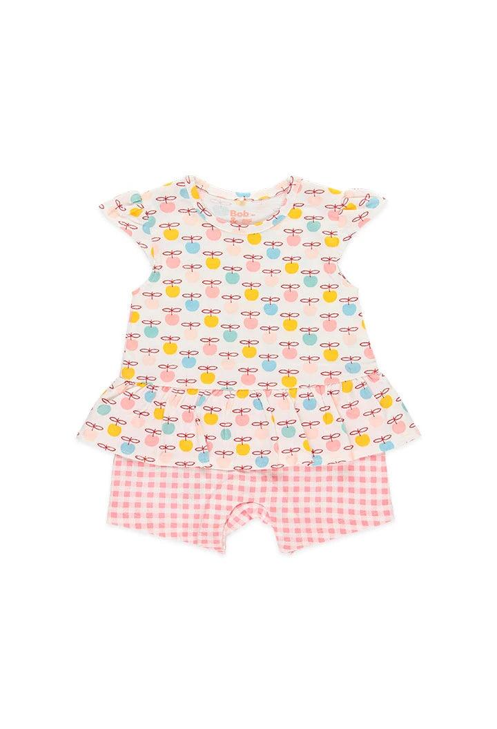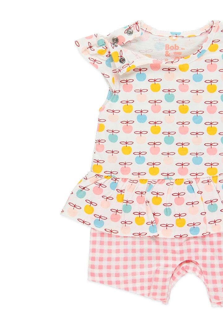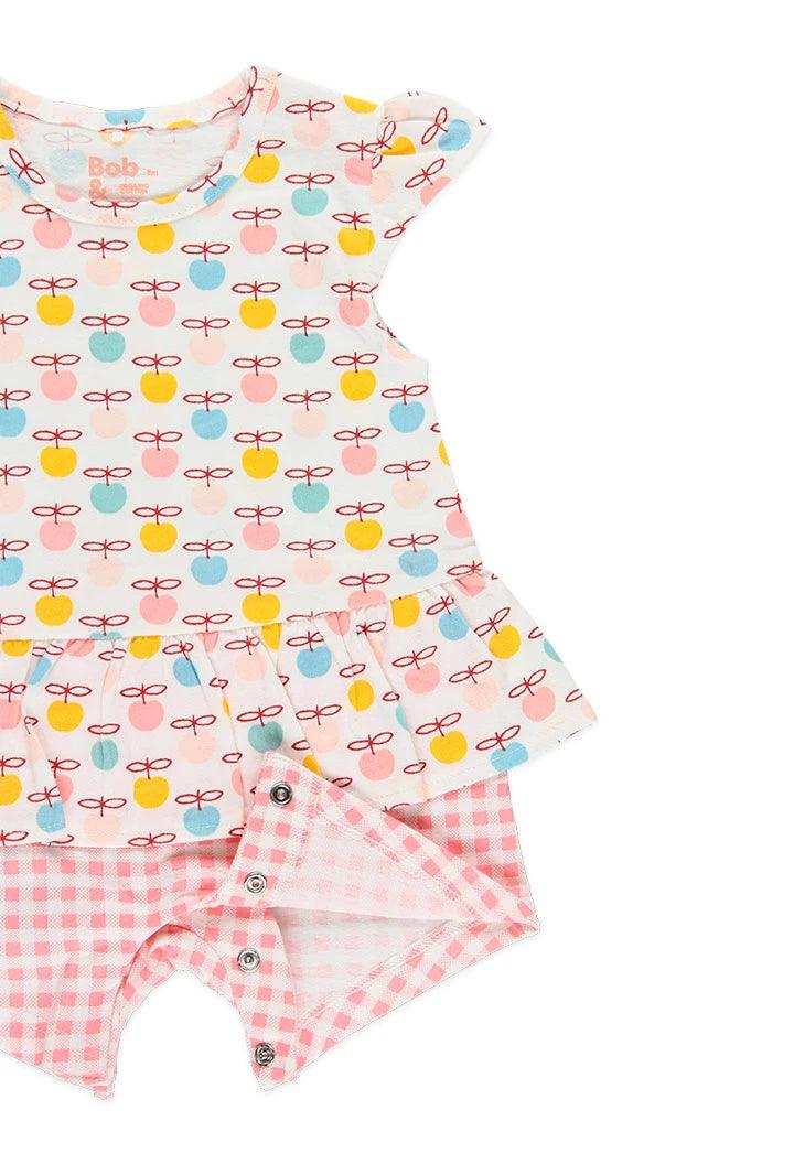 Pelele en punto liso orgánico de bebé niña en manga corta, va partido como si fuera una camiseta y un pantalón. La parte de la camiseta acaba con un volante y lleva estampado de manzanas de colores. La parte del pantalón va con estampado de cuadros vichy en color rosa . Se abrocha con cierres a presión en los hombros y en la entrepierna. Disponible de la talla 0 meses a la talla 2 años.
