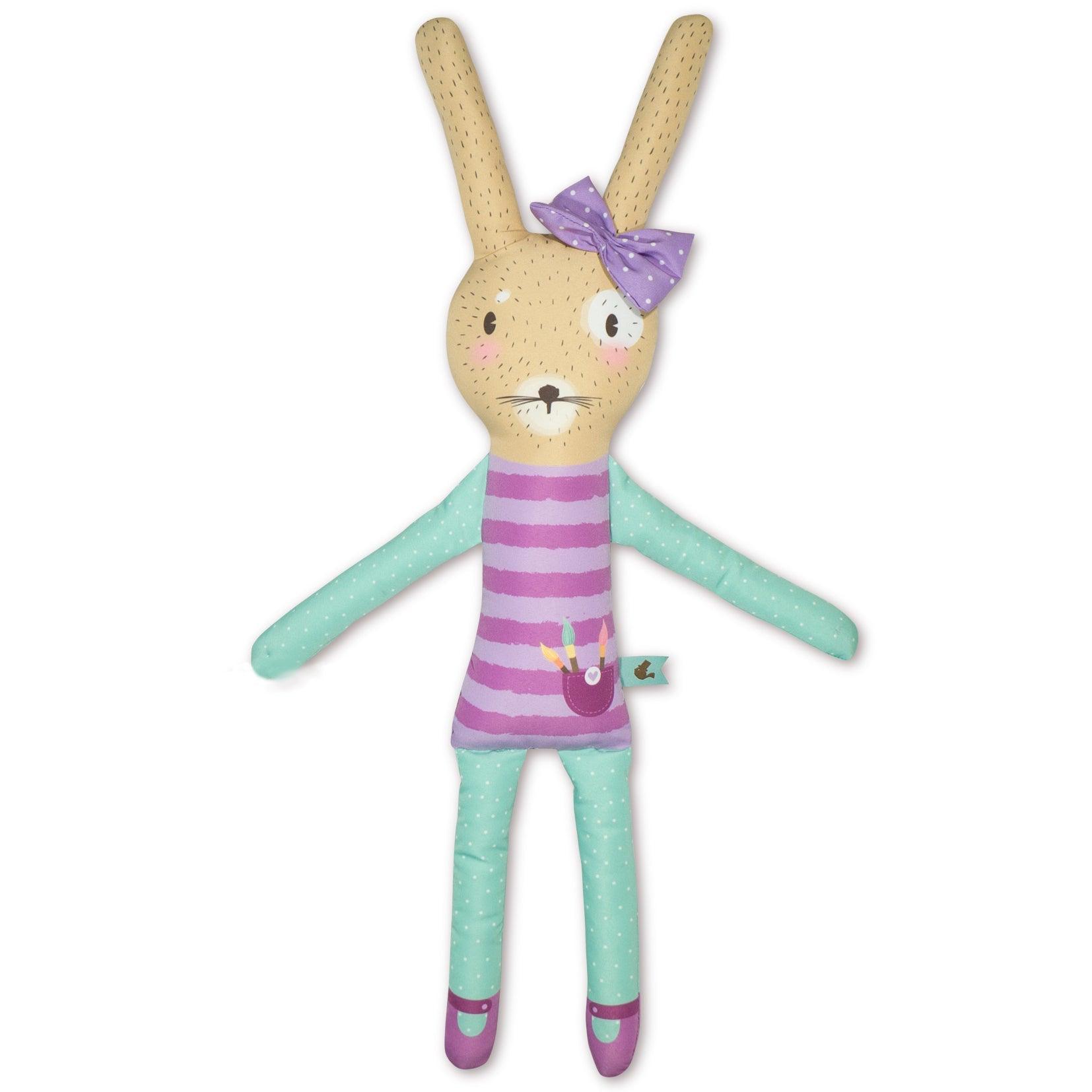 Muñeco en tela antifluido de fácil lavado y secado con relleno en algodón poliéster. La conejita Lucy es muy creativa. ¡Le encanta pintar y usar sus colores para dar alegría a tu mundo!