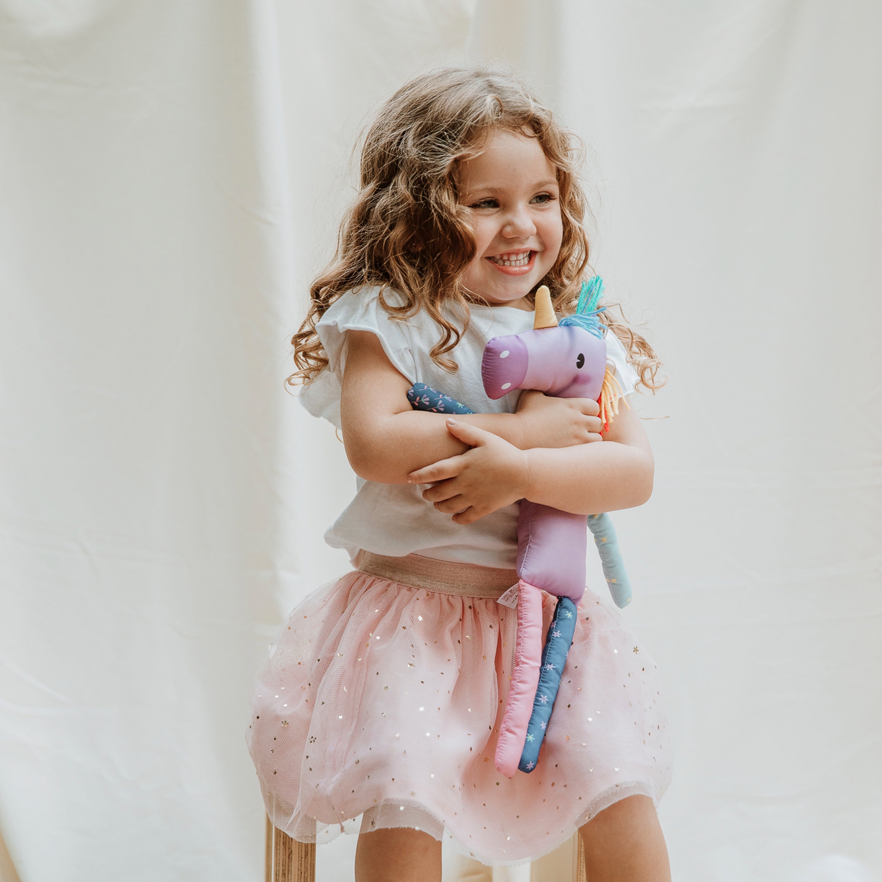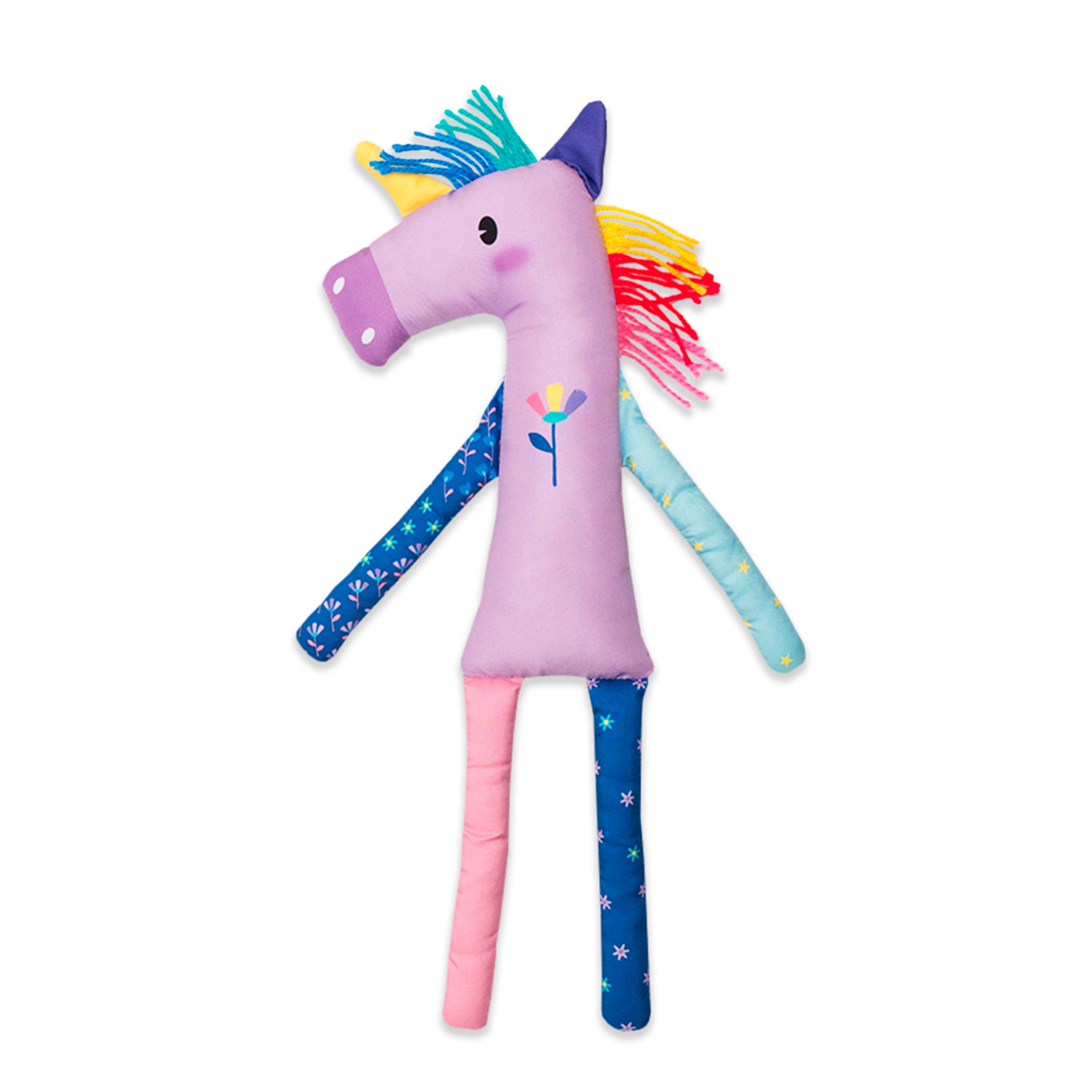 Muñeco en tela antifluido de fácil lavado y secado con relleno en algodón poliéster. El unicornio Arcoíris tiene polvos mágicos que ayudan a volar. ¡También le encanta cantar y es muy divertido!