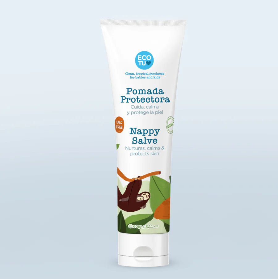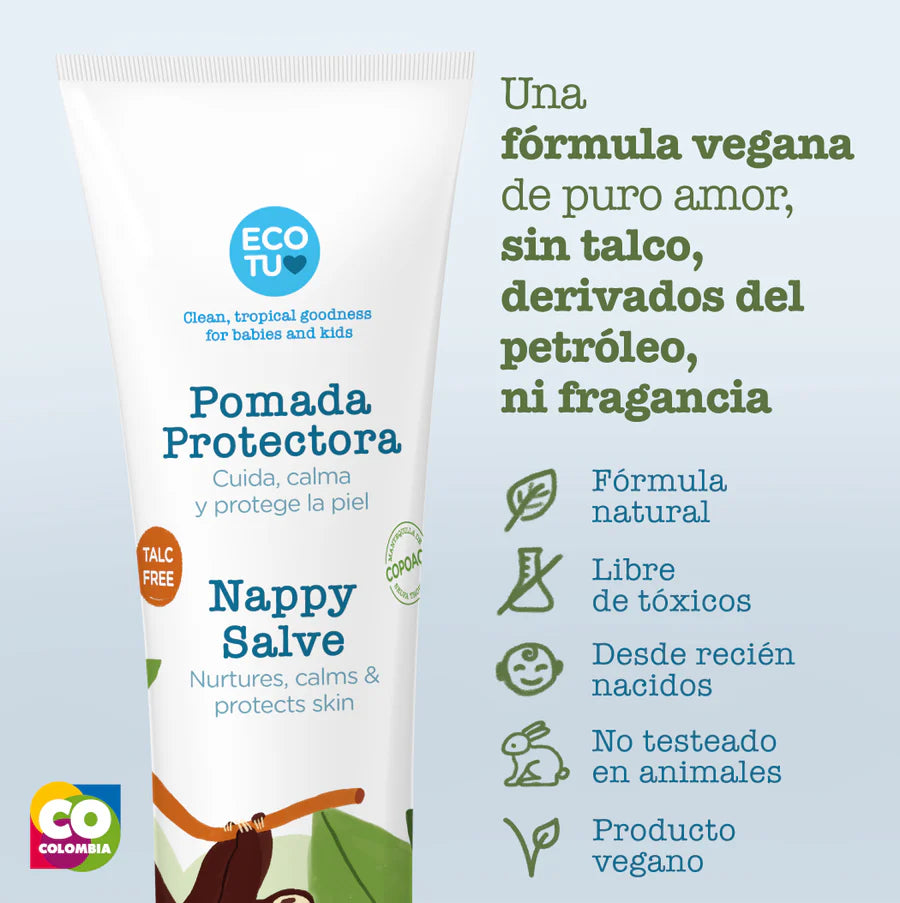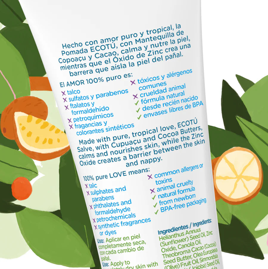 La Pomada Protectora Ecotú cuida y protege la piel de tu bebé desde el primer día. Su fórmula 100% natural, libre de talco, derivados del petróleo y fragancias sintéticas, crea una barrera eficaz contra la humedad e irritaciones. Enriquecida con mantequillas de Copoazú y Cacao, junto con extractos botánicos de Caléndula y Quínoa, nutre, calma y regenera la piel con cada aplicación.