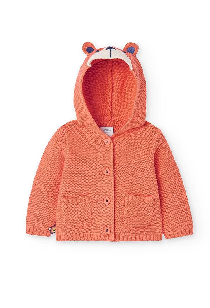 Chaqueta de tricotosa fina para bebé unisex. Tallas de la 0m a la 2 años. Es en color naranja con una cara de león en la capucha. Se cierra con botones. Tiene etiqueta con detalle de la marca.