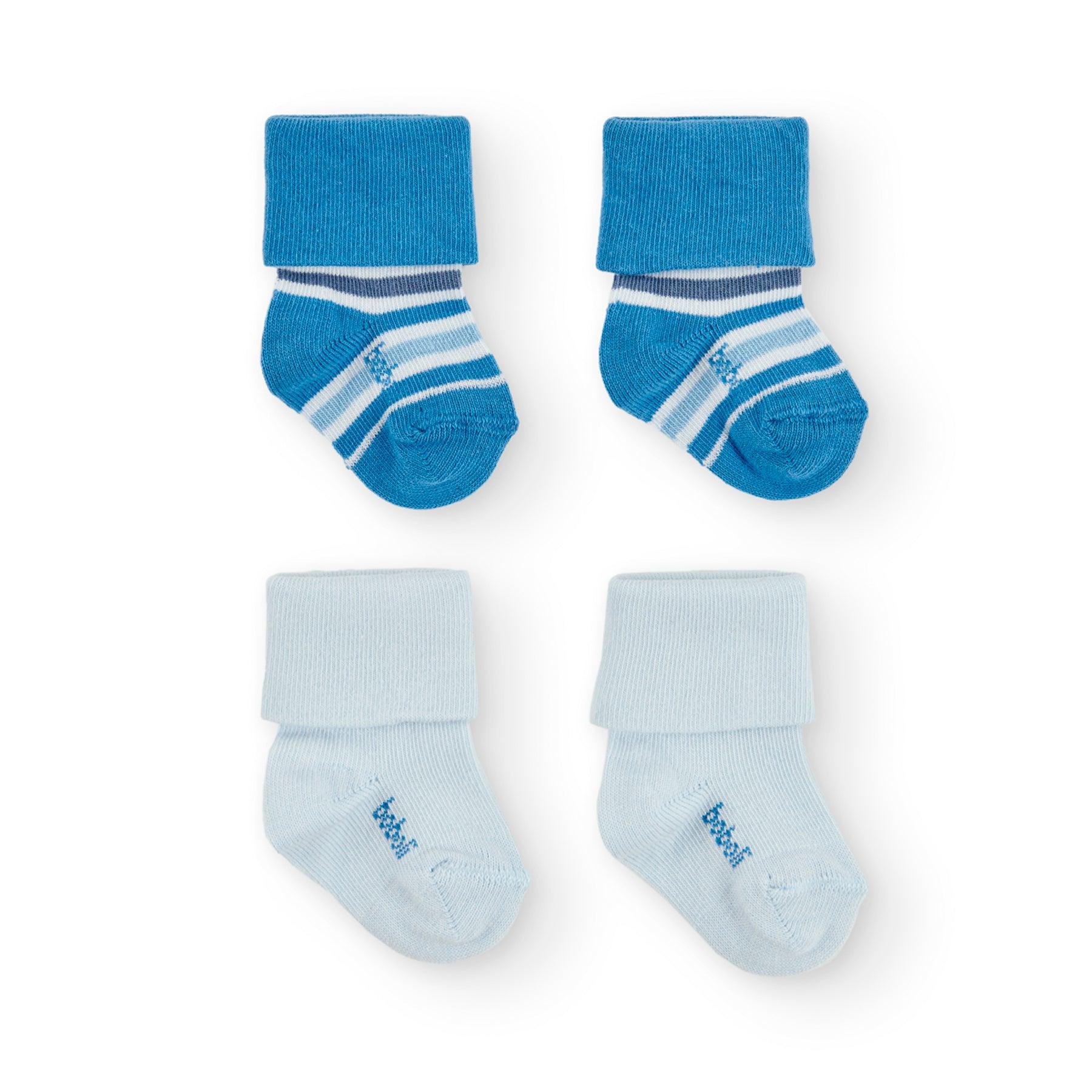Pack de 2 pares de calcetines para bebé niño. Tallas desde la 16 hasta la 24. Un par es de color celeste y el otro es en azul con rayas de diferentes azules.