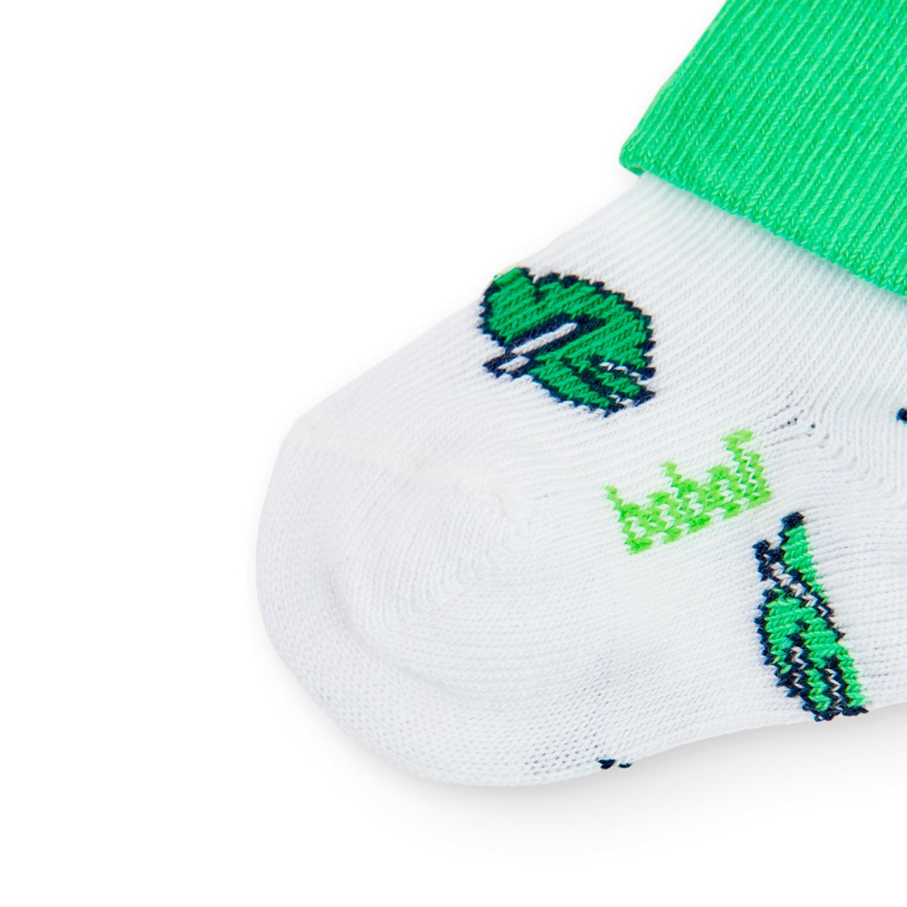 Pack de 2 pares de calcetines para bebé niño. Tallas desde la 16 hasta la 24. Un par es de color verde con rayas blancas y el otro es blanco con hojas verdes.