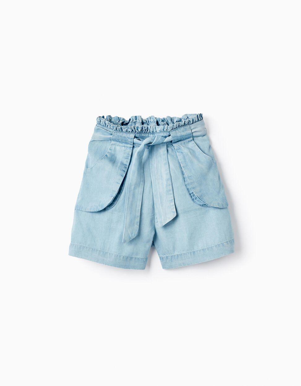 Shorts vaqueros azules para niña, 100% liocel. Bolsillos laterales salientes. Cintura elástica con volantes y cinta integrada. Una prenda ligera y cómoda, ideal para looks casuales y llenos de estilo.