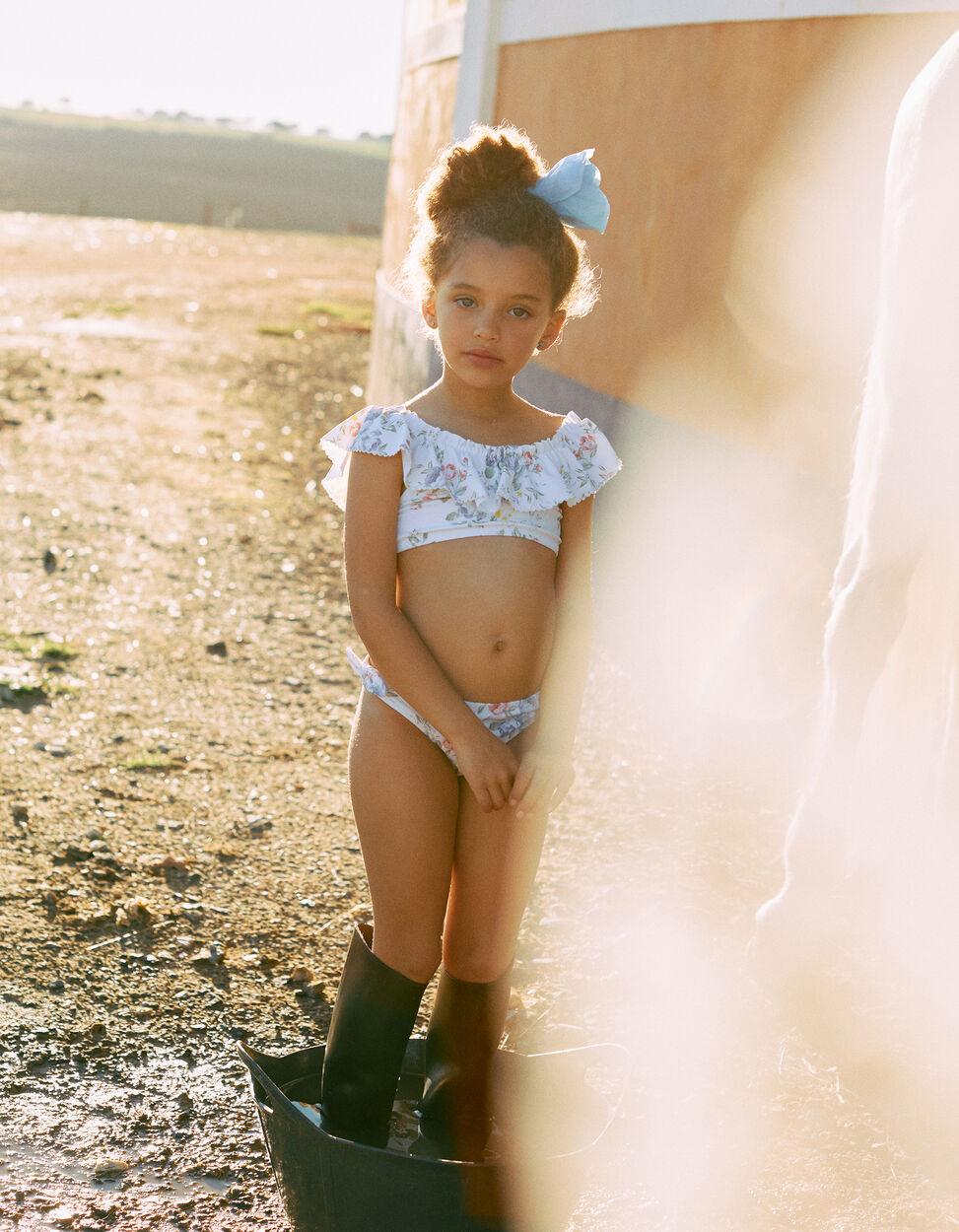 colección You & Me, para padres e hijos. Bikini blanco con estampado floral en tonos de azul, verde y rosa para niña. Top con volantes y elástico en la espalda para un ajuste perfecto. Braguita tradicional con forro para máximo confort. El traje de baño ideal para un verano en familia. We Care: Tejido con factor de protección solar 80, de acuerdo con el certificado UV Standard 801, que garantiza la eficacia del tejido en estado seco, mojado, estirado y después de lavados.
