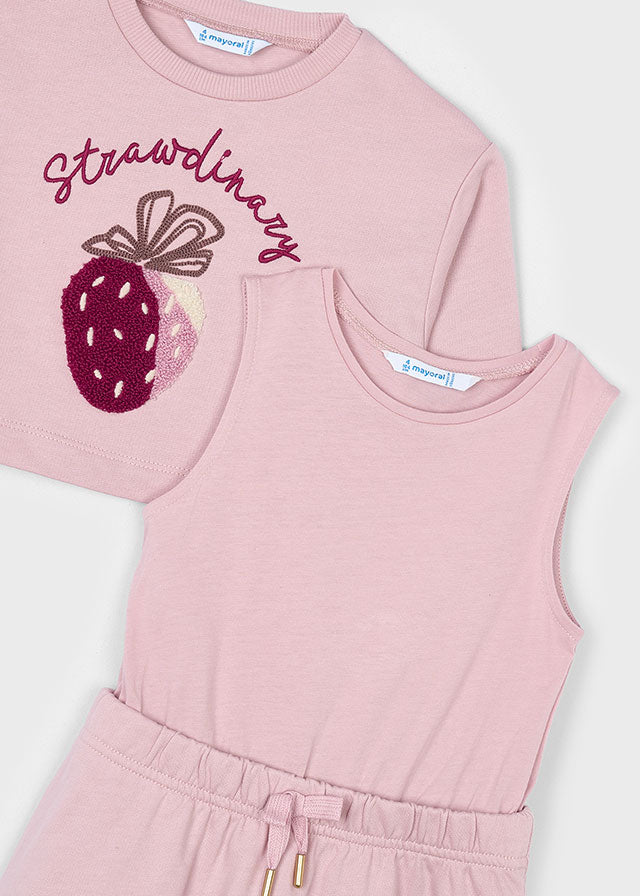 El Conjunto Saco Fresa Rosa Mayoral es ideal para dar a tu niña un look encantador y práctico. Incluye un pullover de algodón con elastano, suave y flexible, y un vestido 100% algodón, fresco y cómodo. El diseño en tono rosa con detalle de fresa aporta ternura y estilo, perfecto para el día a día o salidas especiales.
