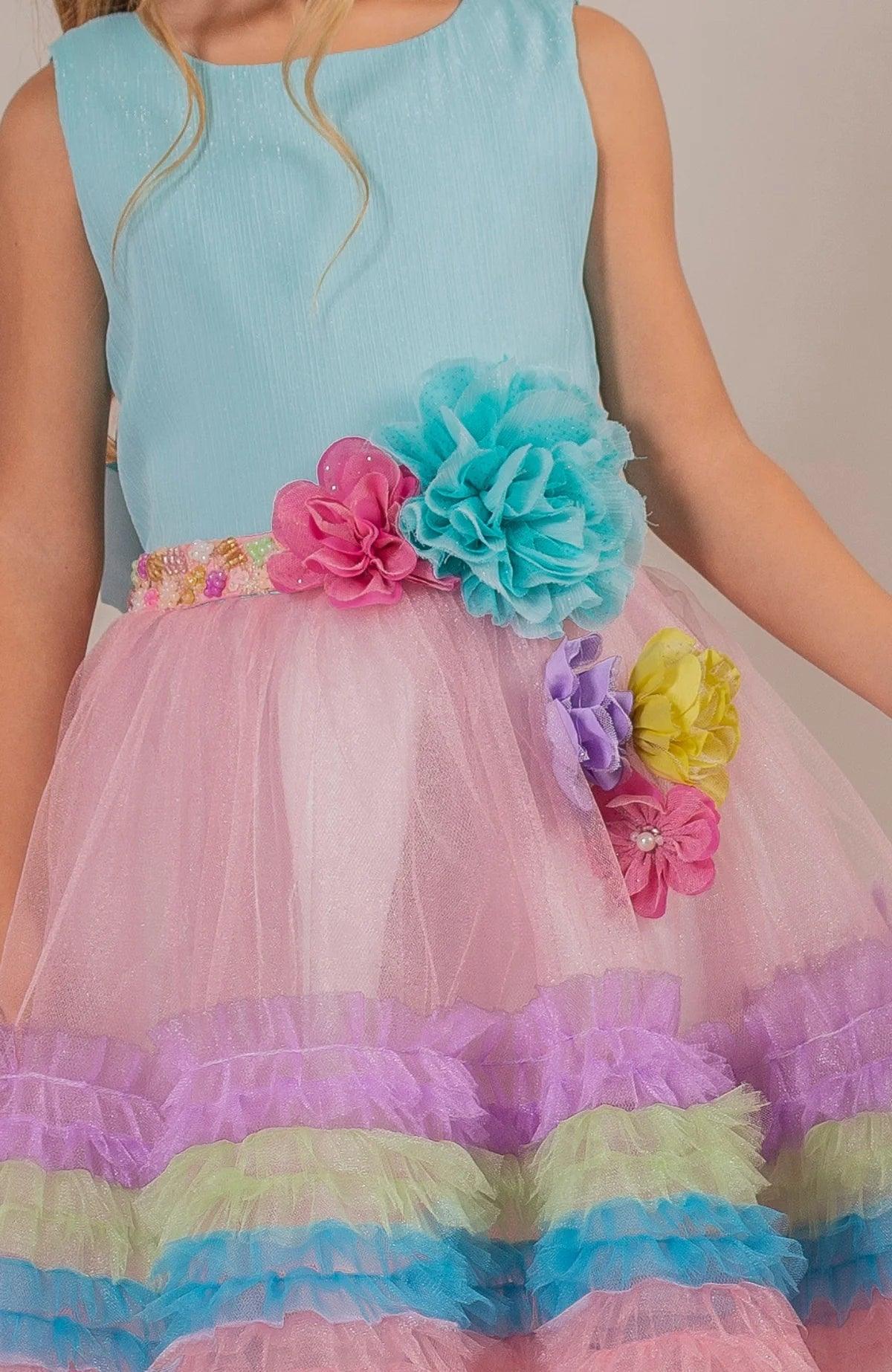 Vestido para niña con un diseño alegre y colorido que hará que tu pequeña se sienta feliz. Cuenta con un top rosa con destellos brillantes y una falda de tul con boleros multicolor en tonos pastel y hermosas flores de tela en la cintura. Es lo más bonito para celebraciones y fiestas de cumpleaños temáticos.
