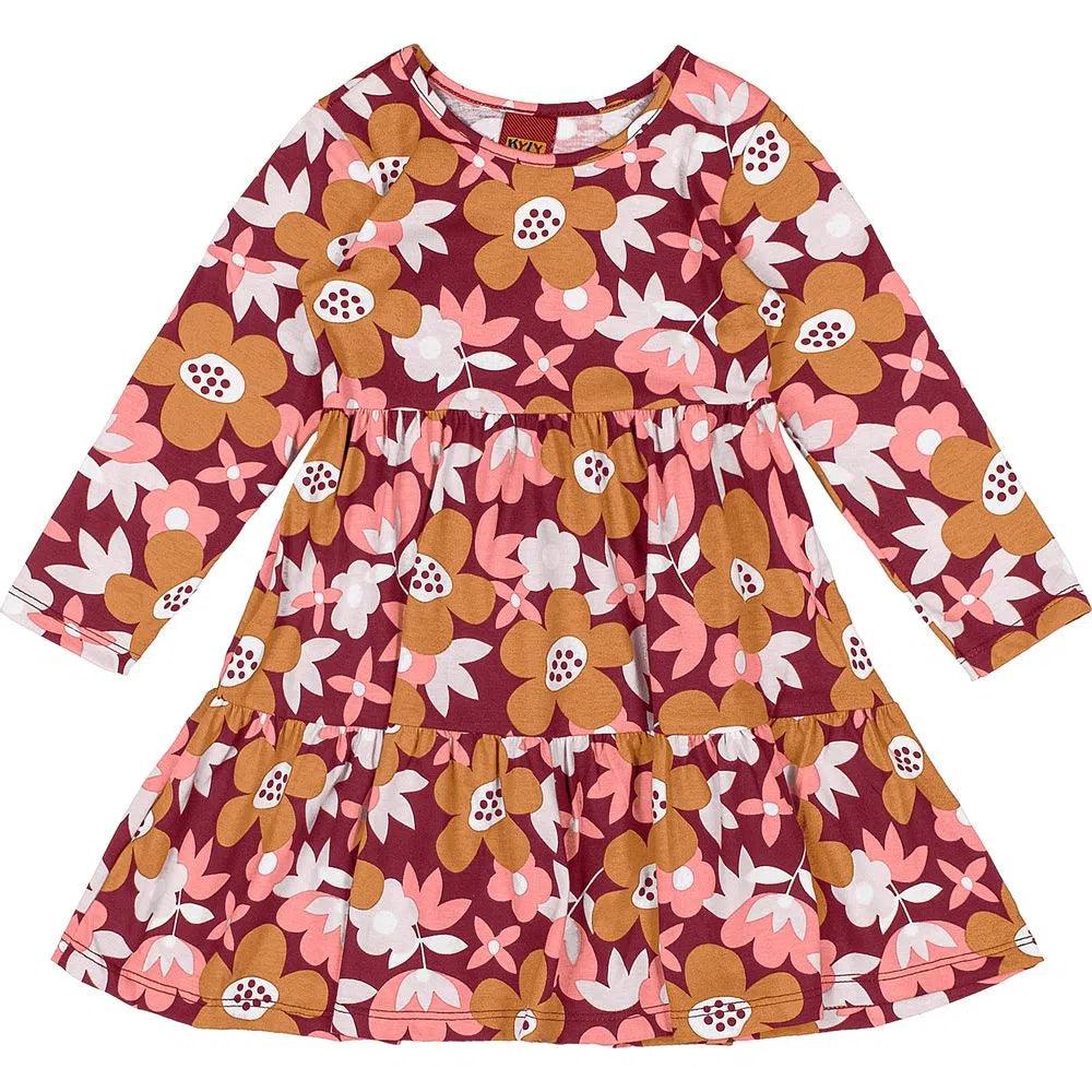 Vestido Infantil Kyly confeccionado en Meia Mesh , presenta aberturas en delantero y espalda con una ligera raya dejando la pieza suelta, colorido estampado floral rotativo, manga larga y terminación en escote con vivo.