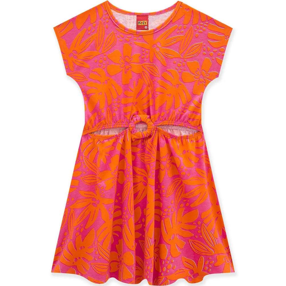 El Vestido Infantil Kyly está confeccionado en media malla, tiene corte holgado, estampado de flores giratorias, abertura en la cintura con detalle de anilla que le da carácter a la pieza, acabado en escote y sisas con ribete.