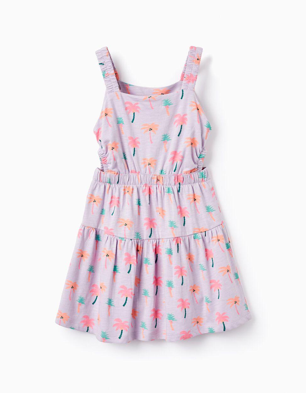 Vestido lila para niña, con estampado tropical de palmeras en tonos de naranja, verde y coral. 100% algodón. Tirantes elásticos. Cintura elástica con aberturas en los laterales. Una prenda práctica, cómoda y llena de color, perfecta para el verano.