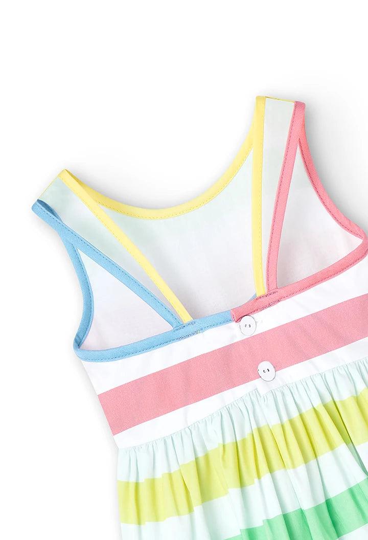 Vestido de niña sin mangas de satén con estampado de rayas multicolor.El escote y las sisas acaban con vivos de colores.Lleva como decoración flores de gasa en el delantero.La espalda es fantasía con tirantes de colores. La prenda se abrocha mediante botones en la espalda a tono.El vestido va forrado